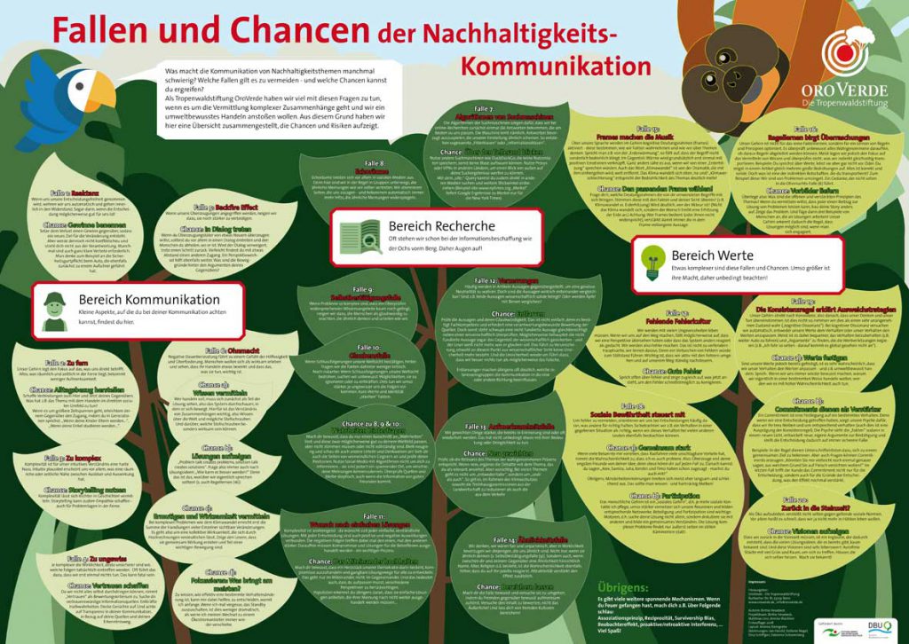 Inzwischen gibt es umfangreiche und sehr empfehlenswerte Literatur rund um das Thema Nachhaltigkeits-Kommunikation. Psychologen, Hirnforscher, Journalisten und viele andere Experten diskutieren die unterschiedlichsten Facetten. Um einen Überblick über die verschiedenen Perspektiven zu geben, hat die Tropenwaldstiftung OroVerde -im Rahmen eines von der Deutschen Bundesstiftung Umwelt und der Stiftung Umwelt & Entwicklung NRW geförderten Projektes- auf einem Poster die „Fallen und Chancen der Nachhaltigkeits-Kommunikation“ zusammengestellt. Und zwar in einer Form, die es ermöglicht, die verschiedenen “Fallen” und “Chancen” immer wieder wie eine Checkliste zu nutzen, um die eigene Arbeit zu hinterfragen und zu verbessern. Zwanzig Fallen und ebenso viele Chancen führen in einige wichtige psychologische Hintergründe ein.