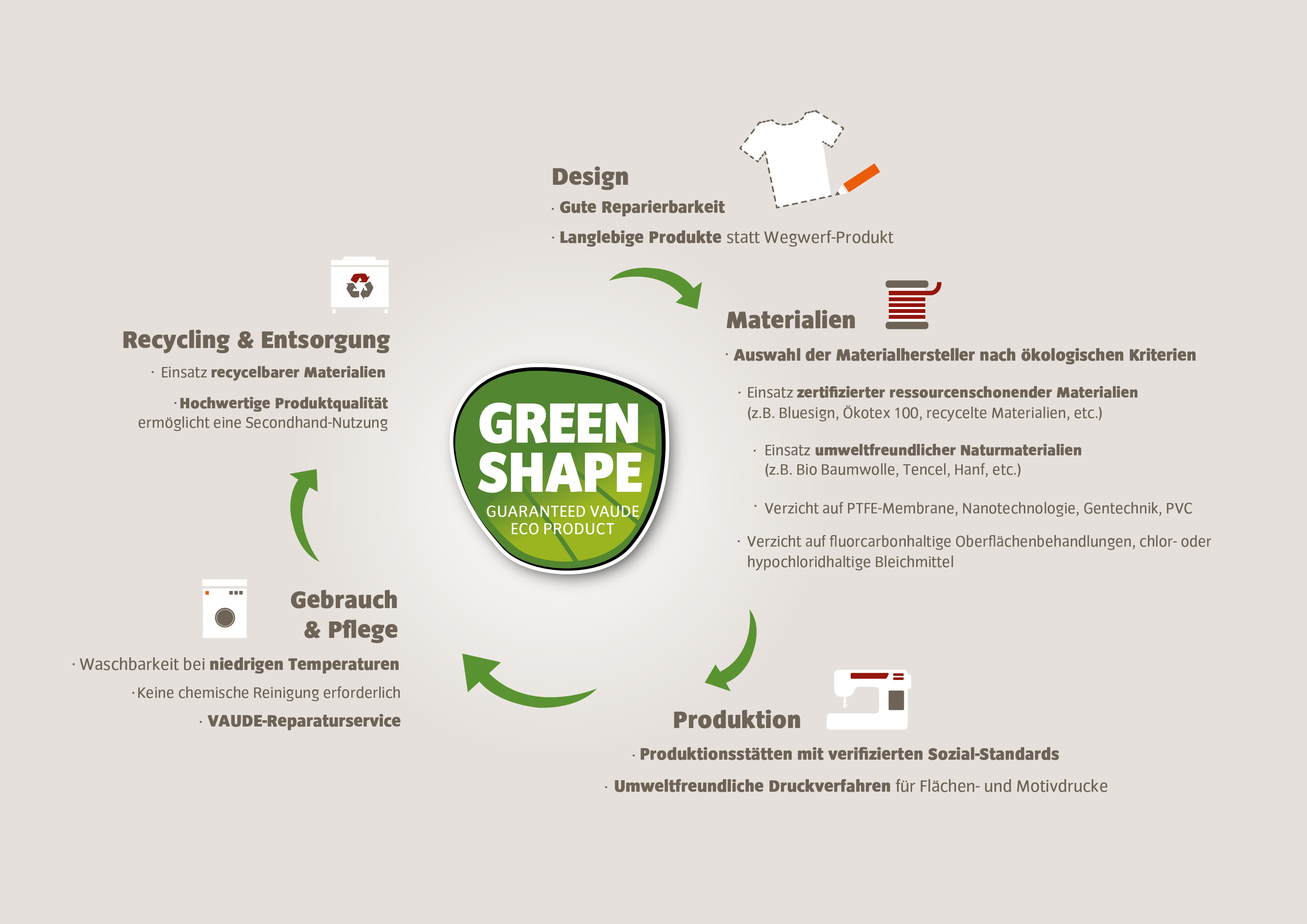 VAUDE hat vor einigen Jahren selbst ein Siegel erfunden, weil es eben keines gibt, was alle unsere Produkte abdeckt: VAUDE Green Shape. Die Kriterien umfassen den gesamten Produktlebenszyklus.