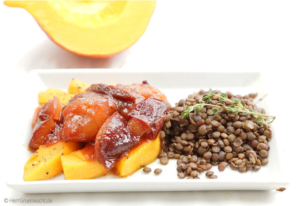 Hauptspeise (2. Option): Gebratener Kürbis mit Pflaumen-Curry-Sauce und grünen Linsen