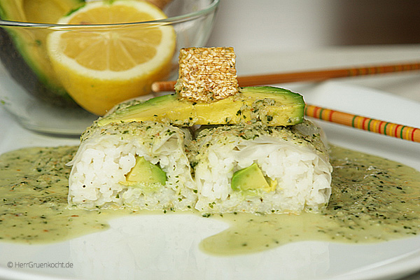- Hauptspeise (1. Option): Vegane Reisrolle mit Avocado, Zitronenmelisse-Kokosmilch und Sesam Crisp