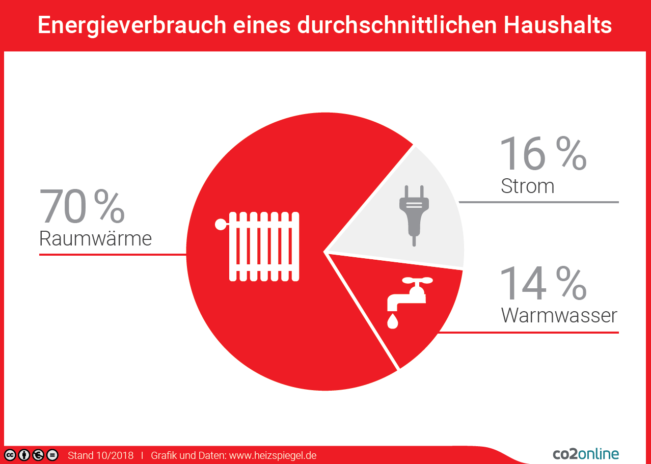 84 Prozent des Energieverbrauchs im Haushalt gehen auf das Konto von Heizung und Warmwasser. Durchschnittlich fast 800 Euro werden dafür pro Jahr fällig. Wer seinen CO2-Fußabdruck verkleinern und seine Nebenkosten senken will, findet hier viele Ansatzpunkte. Wir stellen die 10 wirksamsten Maßnahmen vor, die Energie und Geld sparen.