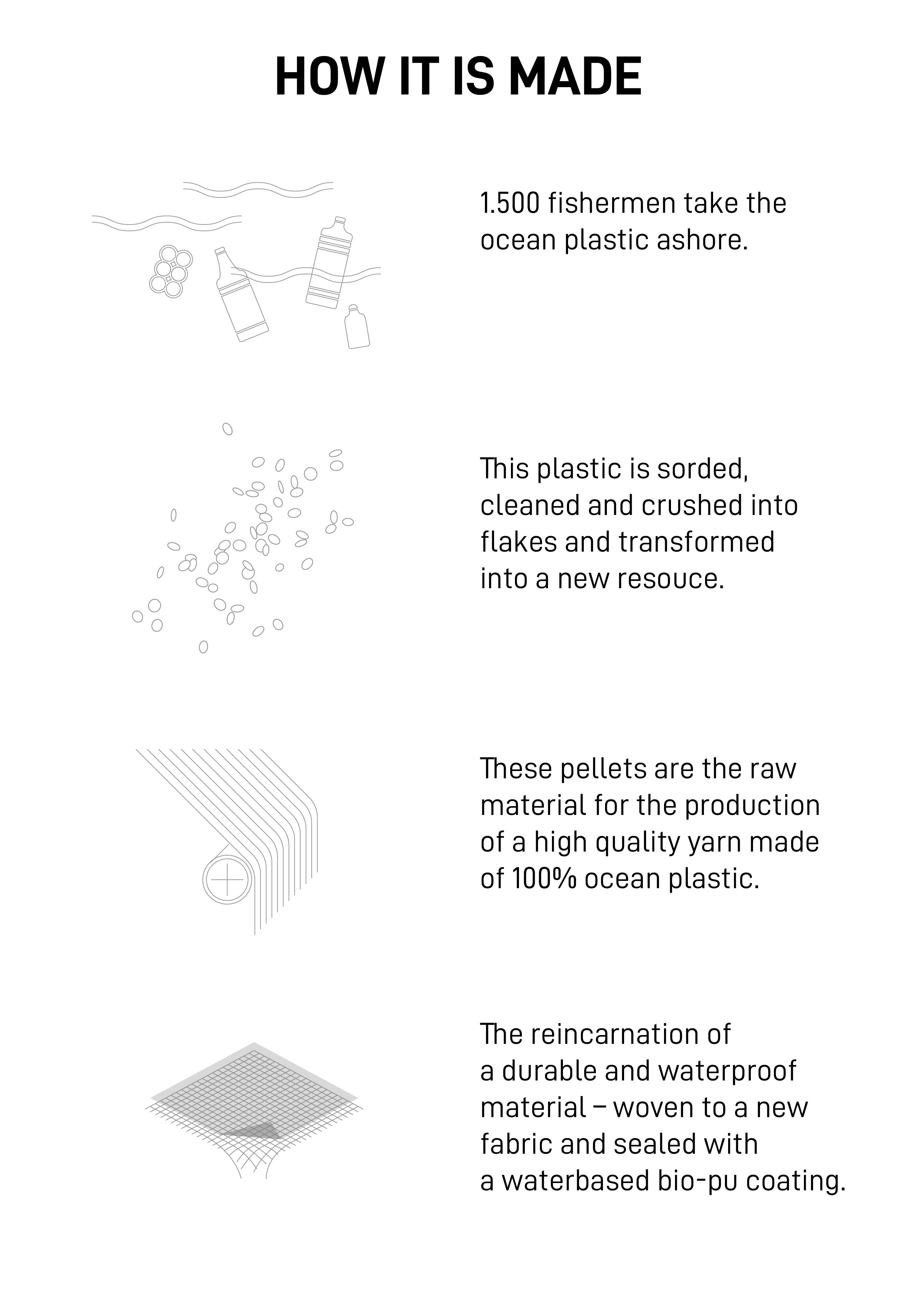 Wir haben vergangen Dezember den weltweit ersten Rucksack aus recyceltem Meeresplastik auf den Markt gebracht. Die Textilien bestehen zu 100 % aus Meeresplastik.