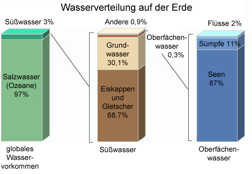 Trotz der großen Menge an Wasser auf der Erde ist nur ein geringer Teil davon als Trinkwasser geeignet (siehe Abb Wasserverteilung). Dieser geringe Teil wird zunehmend in erheblichem Maße belastet, denn im Wasser und im dem das Wasser umgebend Sediment, werden Stoffe akkumulieret, die dort wenig bis gar nichts zu suchen haben, sogenannte anthropogene Stressoren. Hierbei handelt es sich in Alltagssprache übersetzt, um Stressmacher, meinst chemische Verbindungen, die von Menschen hergestellt sind und die das ökologisch Gleichgewicht in den Gewässern stören können.