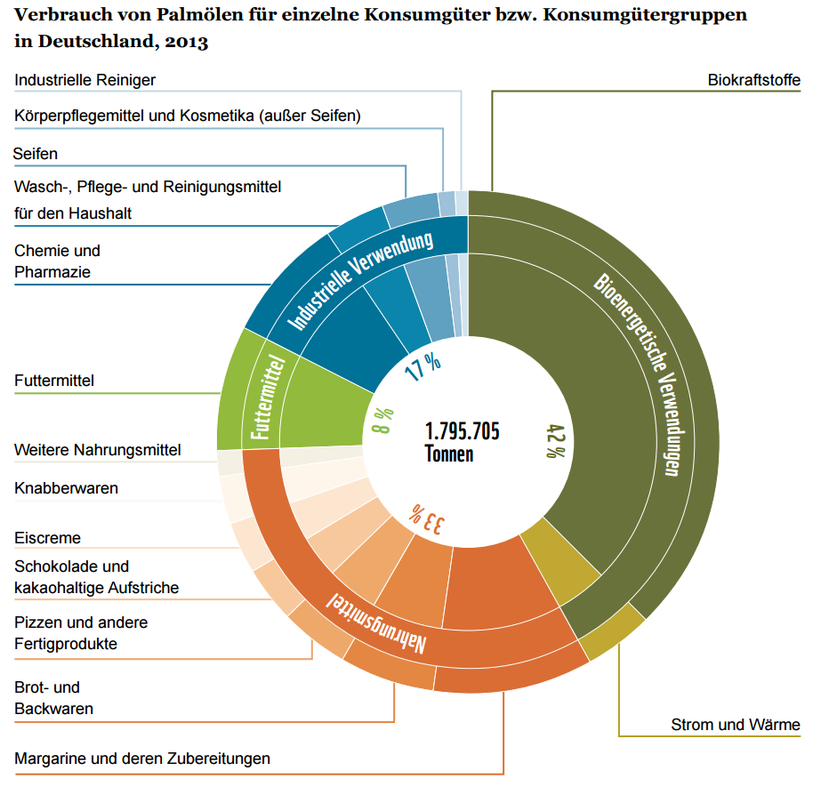 Und dann gibt es da noch eine ganz interessante Zahl für Deutschland. Der größte Einzelanteil, wo Palmöl in Deutschland drin steckt, ist derzeit tatsächlich der Biodiesel. Jeder der also Diesel tankt, tankt häufig auch Palmöl.