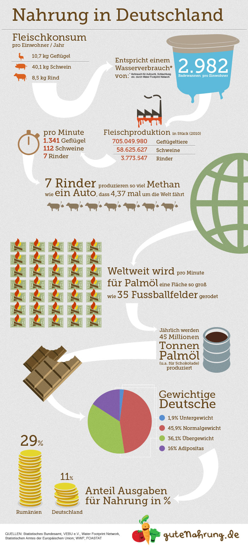 Nachfolgend eine gute Infografik über die Nahrung in Deutschland in Bezug auf u.a. den Fleischkonsum, Wasserverbrauch und Palmöl-Bedarf.