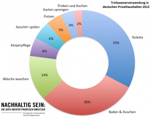 Betrachtet man die Verwendung, kann man für Deutschland als Durchschnittswerte des Wasserverbrauchs diese Verteilung festhalten: Rund 44 Liter entfallen auf baden, duschen und die tägliche Körperpflege, 33 Liter auf die Toilettennutzung, 15 auf Wäsche waschen, 11 Liter für Keingewerbe, 7 Liter auf Putzen, Autopflege und Garten sowie 7 Liter auf Geschirr spülen und 5 Liter für Trinken und Kochen (siehe Infografik 2 – Stand 2014; die Daten aus dem Jahr 2012 finden Sie hier.)