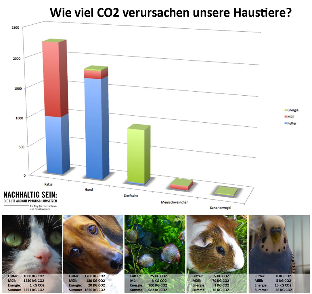 Hier zeigt sich, dass Tierbesitzer durch kleine Veränderungen oft schon viel CO2 einsparen können. Wer seinen Liebling ganz klimaneutral halten will, kann als Ausgleich z. B. Bäume pflanzen. Der CO2-Rechner zeigt, dass für Katze und Dackel vier Bäume, für Fische zwei und für das Meerschweinchen und den Wellensittich ein Baum pro Jahr nötig sind. Wer darüber nachdenkt, sich ein Haustier anzuschaffen, sich auch Gedanken darüber machen, woher es stammt. Einen Hund oder eine Katze aus dem Tierheim zu holen ist in Bezug auf CO2 sicherlich vernünftiger als auf den nächsten Wurf vom Züchter zu warten.