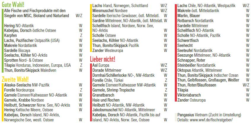 Nicht vor dem Aussterben bedroht und daher eine Gute Wahl sind u.a. Hering (NO-Atlantik), Kabeljau, Dorsch (östliche Ostsee), Karpfen, Lachs (Pazifischer Ostpazifik, USA), Makrele (Nordatlantik) und Sardelle (Biscaya)