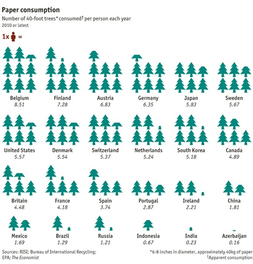 Vor allem die Industriestaaten konsumieren viel Papier. Das Holz dafür kommt aus Wäldern rund um den Globus. Fast jeder zweite industriell geschlagene Baum fällt für die Papierproduktion. Laut dem Worldwatch Institute stammen etwa 17 Prozent aus Urwäldern.