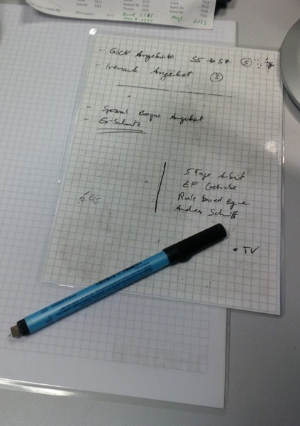 - Keine Notizzettel /PostIts nutzen, sondern einmalig ein Blatt laminieren und mit einem abwischbaren Folienstift darauf schreiben. So hält das eine Blatt viele Jahre lang. Hier ein Bild zur Veranschaulichung. Danke an Matthias für den tollen Tipp.